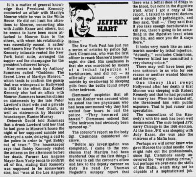Pretty spicy stuff! Except there are some major red flags. The first is that Clemmons was NOT the investigating officer nor was he head of her case. He was the first responding officer who left after 30 minutes to an hour, depending on the source. Clemmons paints himself as this renegade detective but there is nothing to support his ludicrous claims. What we do know is that he most likely handed over some information about the case to Frank Capell for his pamphlet/book “The Curious Death Of Marilyn Monroe”. You can find more about the connection between Capell and Clemmons here.