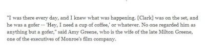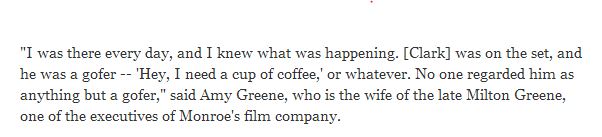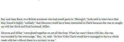 Overall Clark’s dramatic retelling of events is both comical, slanderous, and invasive. While no one can claim that Marilyn was a saint when it came to being faithful, she wasn’t going to have a serious flirtation 2 months after marrying Arthur. By all accounts, Marilyn was quite infatuated with Arthur and had been for a number of years. She tried desperately to make her marriage work as did Arthur. She wasn’t going to throw a wrench in her life so easily. Clark continues the idea that Marilyn was a drug addicted floozy who was always looking for love in the wrong places. She deserves more credit than that.
