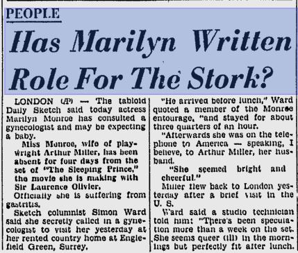 This is the most damning evidence that Clark is not telling the truth. Marilyn reportedly found out she was pregnant in early September. Arthur Miller returned to the States on August 27th being his daughter was sick. He was apparently told around September 3rd that Marilyn was pregnant and flew back the 4th or 5th (accounts vary but most agree he left on the 4th and arrived on the 5th). Marilyn then possibly had a miscarriage on the 8th of September although looking at her work schedule this looks to be false as well. While the articles below suggest that Marilyn did meet with a gynecologist in late August/early September, she had no significant break from filming after September 7th. If she did have one, it would have been between August 31-September 7th. Marilyn spent nearly two weeks in the hospital with both miscarriages yet no hospital stay has been recorded with her trip to England. Huge thank you to Michelle Morgan for confirming this for me. If Marilyn had miscarried again 10 DAYS LATER or even 18 days later (again though, no medical records support this), it would have been like another period for her. It is highly unlikely Marilyn became pregnant again before Arthur leaving for Paris on the 13th. It also would have been impossible for her to know she had miscarried being the egg actually implants 23 days after the last period. Her body would have treated her possible miscarriage on the 8th as her last period.