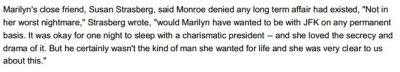 Overall an affair with JFK is all based off of assumption. We have one disputed night that could have lent itself to a one night stand and that really is it. Marilyn’s days with JFK are pretty well documented. To believe anything else is going off of the words of Robert Slatzer, a source we can all agree is not reliable. Finally, I leave you with this quote by Susan Strasberg.