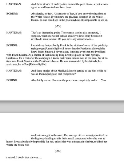 “No serious biographer can maintain the existence of an affair between Marilyn and the Kennedys. All we can say for sure is that the actress and the President have met 4 times, between October 1961 and August 1962, and it was during one of those meetings, that they called to a friendly relation of Marilyn from a bedroom. Shortly after, Marilyn confided this sexual relation to her close relatives, insisting about the fact that their affair ended there”.