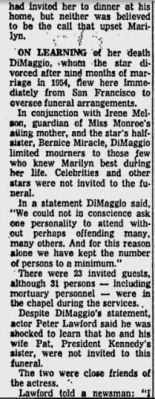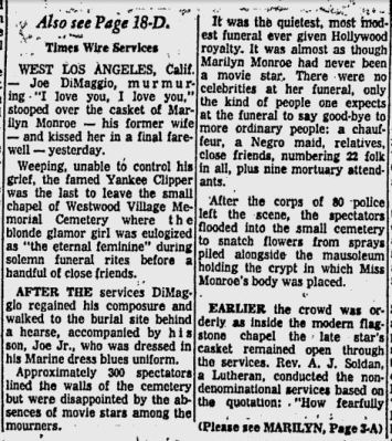 Sadly, while Joe’s love cannot be contested, there is no reason to assume they were getting remarried besides second and third hand testimony, creative spins from authors, and reading into items and events. The only safe thing we can say is that they were friends and possibly seeing one another romantically from 1961 until her death. How this has turned into them getting remarried is beyond comprehension for me. It appears that the remarriage of August 8th has become another story to make her life much more tragic. A lovelorn Joe forced to bury his true love on what was supposed to be the day of their remarriage makes for a great story but sadly one without merit.