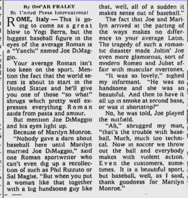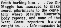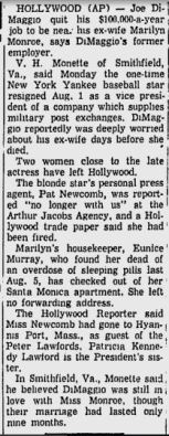 You’ll notice how there is no talk of a remarriage in any of the clippings above. Those rumors start much later and to my knowledge were first printed in Maury Allen’s 1975 book “Where Have You Gone Joe DiMaggio?” from his interview with Monette. Monette gives no dates and says that “Joe thought that she had finally agreed to leave the movies and remarry him.” The date of the eighth appears to have originated with Spoto who gives no sources for the actual date. It should be noted that Spoto use an antique’s dealer’s testimony as proof of a remarriage yet says that Marilyn wanted to keep the news private. Knowing how private Marilyn was, it seems very unlikely that she would tell a random person that she was going to marry “someone I have married before”.