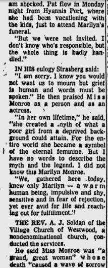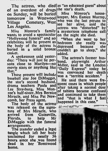 Sadly, while Joe’s love cannot be contested, there is no reason to assume they were getting remarried besides second and third hand testimony, creative spins from authors, and reading into items and events. The only safe thing we can say is that they were friends and possibly seeing one another romantically from 1961 until her death. How this has turned into them getting remarried is beyond comprehension for me. It appears that the remarriage of August 8th has become another story to make her life much more tragic. A lovelorn Joe forced to bury his true love on what was supposed to be the day of their remarriage makes for a great story but sadly one without merit.