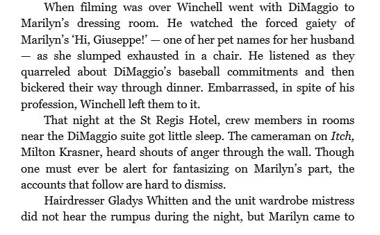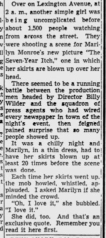 Interview snippets from Anthony Summer’s “Goddess” about what happened after the dress scene was filmed for “The Seven Year Itch”.