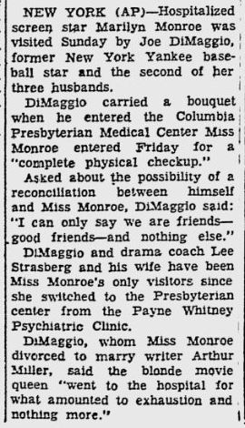 You’ll notice how there is no talk of a remarriage in any of the clippings above. Those rumors start much later and to my knowledge were first printed in Maury Allen’s 1975 book “Where Have You Gone Joe DiMaggio?” from his interview with Monette. Monette gives no dates and says that “Joe thought that she had finally agreed to leave the movies and remarry him.” The date of the eighth appears to have originated with Spoto who gives no sources for the actual date. It should be noted that Spoto use an antique’s dealer’s testimony as proof of a remarriage yet says that Marilyn wanted to keep the news private. Knowing how private Marilyn was, it seems very unlikely that she would tell a random person that she was going to marry “someone I have married before”.