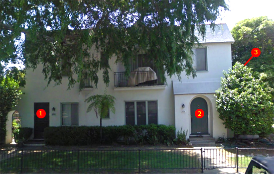 “Waring apartment building today: 1. 8120 Waring, home in 1957 of Florence Kotz – raiding party probably went through gate to the left to get to her back door, 2. 8122 Waring, Marilyn visited Shelia Stewart in this upstairs apartment that night, 3. 754 Kilkea, entrance on side”