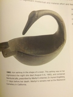 These pictures show that Marilyn was smoking for 9 years. While there aren’t pictures of her smoking in 1961 or 1962 (to my knowledge, if you know of one let me know in the comments and I’ll credit you on here) Marilyn did have matches and a pack of cigarettes on her nightstand the night she died. According to Maite Minguez Ricart, one of the largest collector’s of Marilyn memorabilia in the world, this swan ash tray was also on Marilyn’s nightstand.