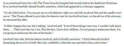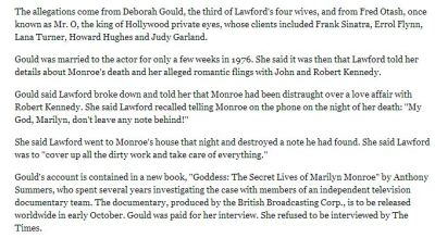 Gould married Lawford after knowing him for three weeks. Their marriage last 2 months. Debra Gould was interviewed by Anthony Summers for his book “Goddess”. This is where the majority of the “statements” from Lawford come from. All of my quotes come from the 1986 paperback edition of “Goddess”