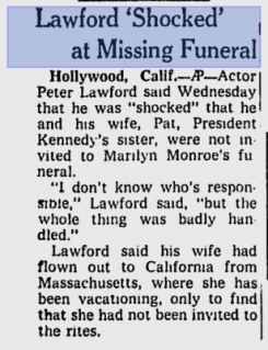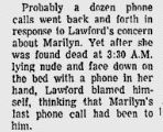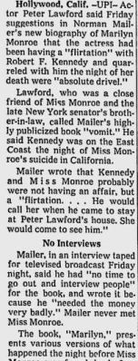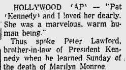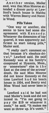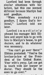 Snippets from Earl Wilson’s book in 1971. This is the first time Lawford claims that Marilyn said “Say goodbye to Pay, the President, and yourself because you’re a nice guy.”