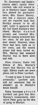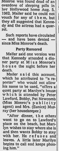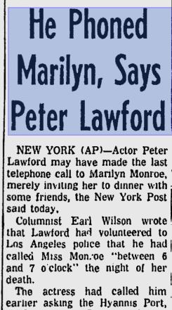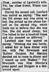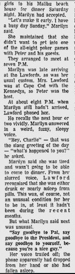 Snippets from Earl Wilson’s book in 1971. This is the first time Lawford claims that Marilyn said “Say goodbye to Pay, the President, and yourself because you’re a nice guy.”
