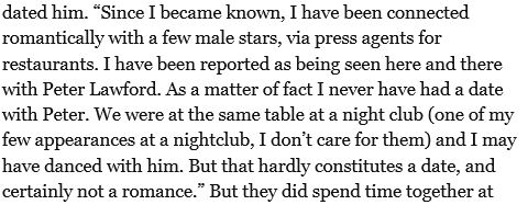 She then goes on to claim that Bobby and Marilyn got involved after Bobby was sent as the “messenger boy” to end Marilyn’s affair with JFK. “Marilyn took it quite bad and Bobby went away with a feeling of wanting to get to know her better. At the beginning it was just to help and console but then it led into an affair between Marilyn and Bobby. From what Peter told me, he fell head over hills.” pg 336