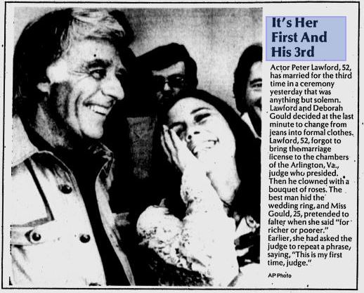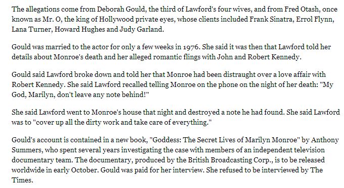Gould married Lawford after knowing him for three weeks. Their marriage last 2 months. Debra Gould was interviewed by Anthony Summers for his book “Goddess”. This is where the majority of the “statements” from Lawford come from. All of my quotes come from the 1986 paperback edition of “Goddess”