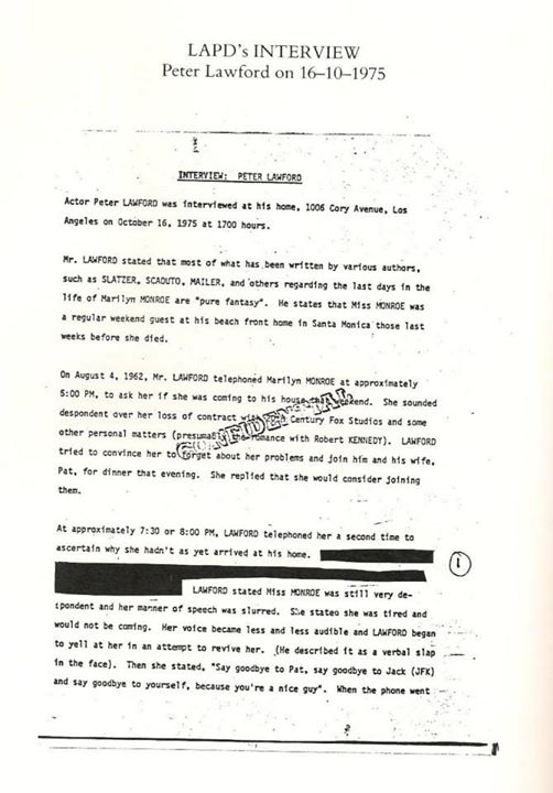 I’m going to start this out by telling you that I always thought Lawford was an alcoholic louse who had just lied after being bitter about his divorce from Pat Kennedy and his unceremonious eviction from the “Rat Pack”. What better way to get back at everyone than to say Marilyn was involved with the Kennedy’s and that Frank had betrayed Marilyn? What I uncovered with the help of Marijane Gray is that Peter is actually quite boring with slight variations in his story.