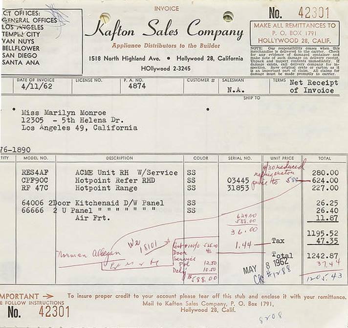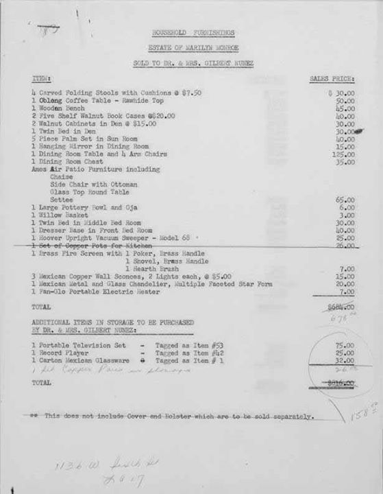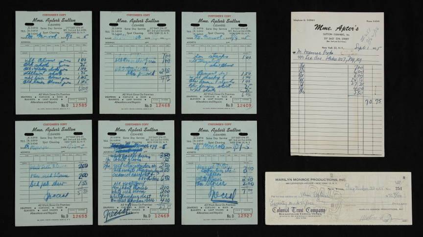 The above pictures are cleaner bills for Marilyn from July and August of 1955. Milton Greene paid them with a check from Marilyn Monroe Productions on September 22, 1955.
