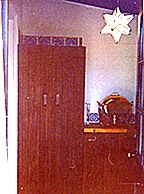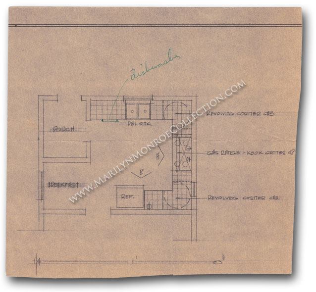 Marilyn purchased an ACME kitchenette in April of 1962 for use while she was remodeling her kitchen. It is the red box in the blue print above. This photo is of the guest house and clearly shows that her kitchenette would have been on the opposite wall, next to a bathroom.